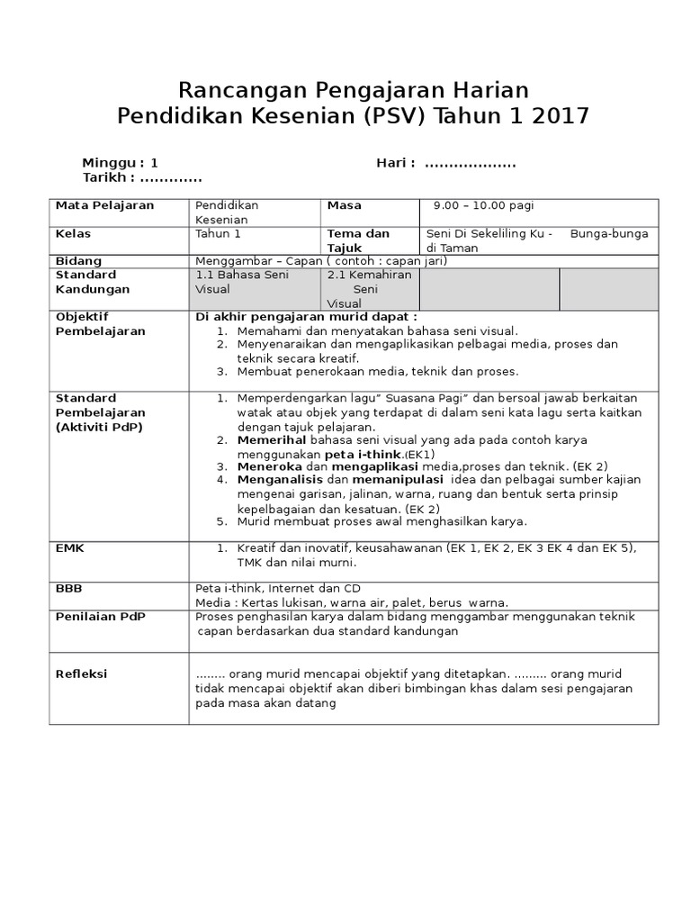 Rph pendidikan kesenian tahun 1 pdf seni visual pak 21 sekolah rendah psv m10 catatan guru besar. Rancangan Pengajaran Harian Pendidikan Kesenian PSV Tahun 2018 Minggu. Rancangan Pengajaran Harian Pendidikan Kesenian PSV Tahun 2 2018 Minggu.